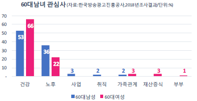60대 남성과 여성은 50대 보다 더 높은 비중으로 건강에 대한 관심을 보이고 있으며, 다음으로 노후가 주된 관심사로 나타났으며, 사업, 취직, 가족관계, 재산증식, 부부 등에 대한 관심은 매우 낮은 수준이었다.