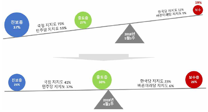 에 치러지면서 더불어민주당의 압승으로 끝났다. 그러나 2020년 4.13 국회의원 선거의 경우 사실상 ‘촛불지형’이 무너지면서 치러질 것으로 보여, 여야간 치열한 접전이 펼쳐질 것으로 전망된다.(아래 그림 데이터는 한국갤럽 자료임) 주관적 이념성향을 볼 때 진보층이 줄고 보수층이 늘어 비슷한 규모가 되었고, 아직까지는 중도층 일부가 문재인 대통령 및 더불어민주당을 지지해 국정지지도와 정당지지도에서 앞서고 있으나 향후 중도층의 지지철회 가능성이 존재한다.