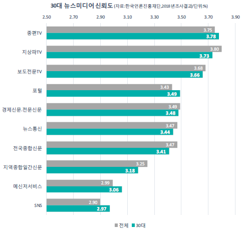 한편, 메신저서비스와 SNS를 통한 뉴스에 대해서는 낮은 신뢰도를 보이지만 국민 전체와 비교할 때는 상대적으로 높은 신뢰도를 나타내, 이는 이른 바 ‘가짜뉴스’에 대한 경계심 때문으로 보여지며, 그럼에도 불구하고 지인들간 공유하는 뉴스에 대해서는 신뢰하는 것으로 분석되었다.