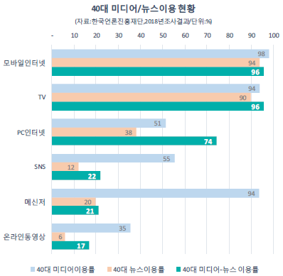 40대의 미디어 이용 20대, 30대와 유사한 흐름을 보이고 있다. 가장 많이 이용하는 미디어는 모바일 인터넷과 TV, 메신저 순이었으며, 뉴스 이용은 모바일 인터넷, TV, PC 인터넷 순이었다.