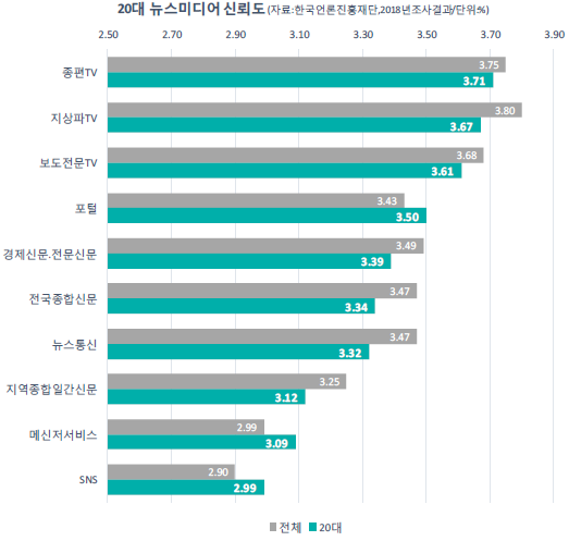언론에서 제공하는 뉴스에 대한 신뢰도를 5점 척도(전혀 신뢰하지 않는다 1점 ~ 매우 신뢰한다 5점)로 조사한 결과, 19~20대가 가장 신뢰하는 뉴스 미디어는 종편TV로 나타났다. 국민 전체적으로는 지상파TV가 높은데 비해 19~20대는 종편TV가 높으며, 이러한 배경에는 JTBC에 대한 높은 신뢰도가 영향을 미친 것으로 보인다. 또한 국민 전체적으로 7번째 순위에 머무른 포털이 19~20대에서는 4위로 올라, 포털사이트에 대한 우호적 태도를 갖고 있는 것으로 나타났다.