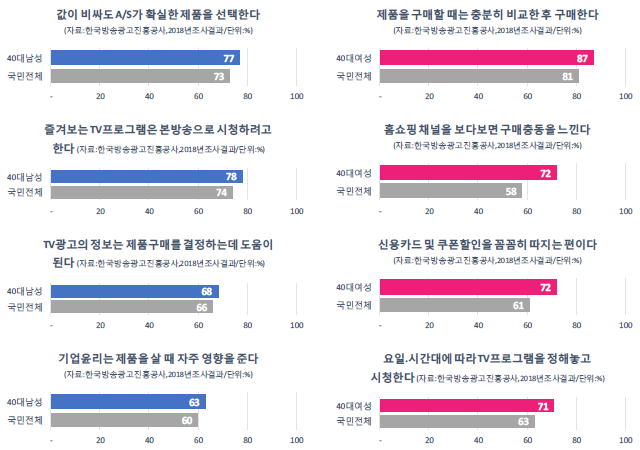 40대 남성은 TV 친화적인 성향이 있고, 트렌드나 디자인 보다 A/S와 기업윤리를 중시한다. 기업윤리를 중시하는 것은 가장 높은 진보성향을 보이는 세대 특성의 연장선에서 이해될 수 있다. 40대 여성 역시 TV 친화적이고 30대 여성과 마찬가지로 매우 꼼꼼한 소비성향을 보이고 있으며, 40대 남성, 여성 모두 자신이 좋아하는 TV 프로그램을 정해놓고 본 방송으로 시청하고자 하는 경향이 강한 것을 볼 때 자신이 상황을 주도할 수 있는 능력과 시간적 여유가 존재하는 세대로 분석된다.