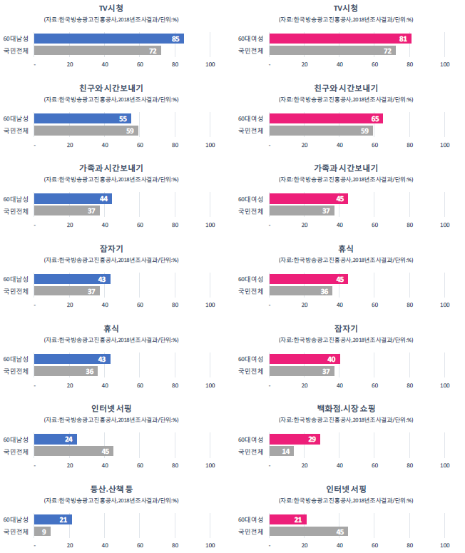 60대 남성은 등산.산책이 후순위에 올랐고, 60대 여성은 백화점.시장 등 쇼핑이 올랐다.