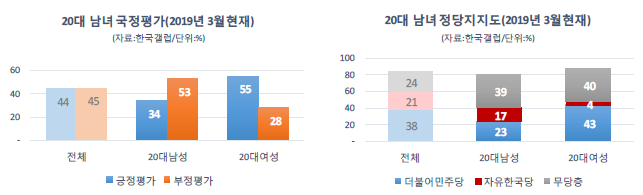 20대 남성은 상대적으로 보수적 성향을 보이는데 비해 여성은 진보적 성향이 높은 것으로 분석되었다. 20대 남성 중 17%가 자유한국당을 지지하고 있고, 14%는 바른미래당을 지지하고 있는 것으로 나타났다(바른미래당 국민전체 지지율은 7%임)