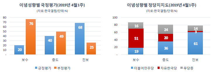 표면적으로 볼 때 진보층과 보수층의 비중이 비슷하기에 내년 총선은 중도층의 표심에 따라 선거결과가 좌우될 것이라는 진단이 가능하다. 더불어민주당 입장에서는 중도층 이탈을 차단해 계속 자신들을 지지토록 만들어야 하고, 자유한국당 입장에서는 중도층 이탈을 촉진하고 포용한다는 의미이다. 그러나 내용을 자세히 들여다보면 아직까지 국민들의 주관적 이념성향 자체가 불완전하고, 이에 따라 이념성향에 따른 국정평가 및 정당지지도 역시 혼란스러운 상황이다. 촛불지형 자체가 이전의 이념지형과 달리 급격하게 만들어졌다는 점에서 그렇고, 지금의 흔들리는 촛불지형 역시 촛불지형이 완전히 무너졌다기 보다 ‘현재 진행형’이라는 점이 그 이유로, 이념성향별 국정평가를 살펴보면 보수층 중 20%는 긍정평가를 하고 있고, 진보층 중 25%는 부정평가를 하고 있는 것을 볼 수 있다.