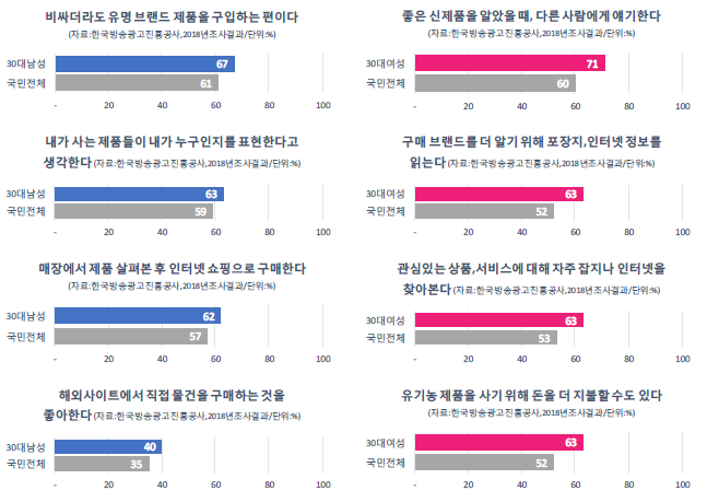 30대 남성은 뚜렷한 취향을 가지고 있으며, 구매한 물건이 자신을 표현한다고 생각하고 있다. 필요하다면 해외 사이트에서 직접 물건을 구매하는 적극성을 보이며, 30대 여성은 소비시 매우 꼼꼼하게 정보를 취득하며, 주변 사람들과 자신의 생각을 공유하는 것을 선호하는 것으로 나타났다. 건강 및 환경에 대한 관심도 높아 유기농 제품이라면 기꺼이 돈을 더 지불할 생각을 갖고 있으며, 이러한 뚜렷한 취향과 꼼꼼함이 정치적으로도 이어져 정부정책과 정당․정치인의 정치행위 등에 대해서도 꼼꼼하게 따지는 것으로 분석된다.