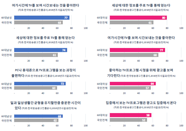 60대 남성은 TV를 통해 세상을 배우고, TV와 함께 시간을 보내고 있었으며, TV 시청을 여유롭게 할 수 있을 시간적 여유도 많았다.