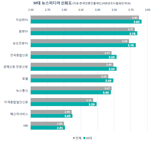 TV 친화적인 50대는 TV관련 미디어인 지상파TV, 종편TV, 보도전문TV 모두 국민전체에 비해 높은 신뢰도를 나타냈다. 50대의 경우 텍스트 보다 영상물을 선호하는 것으로 보여지며, 뉴스통신을 제외한 전 미디어에 대한 신뢰도가 국민전체에 비해 높아 미디어 자체에 대해 많이 신뢰하고 있는 것으로 분석되었다.