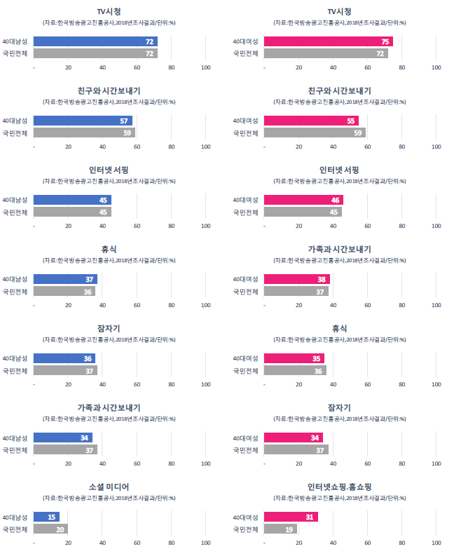 20,30대와 거의 비슷하게 남녀 모두 평일 여가활동 상위 3가지는 TV 시청, 친구 만남, 인터넷 서핑인 것으로 나타났다.
