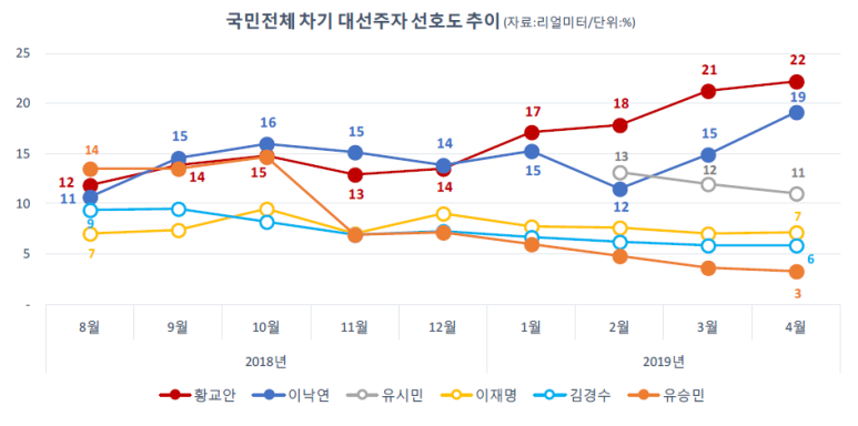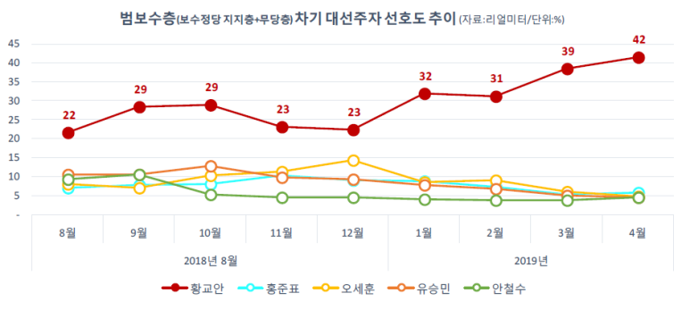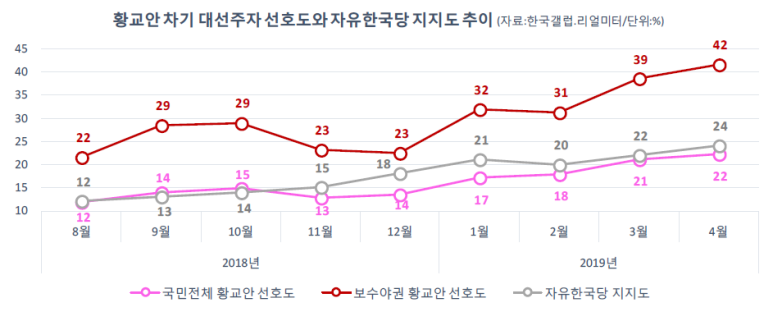 · 2018년 8월 부터 황교안 대표는 22%로 다른 주자들과의 격차가 컸으며, 4월 현재는 40% 가까운 격차를 보이면서 독주하고 있음
