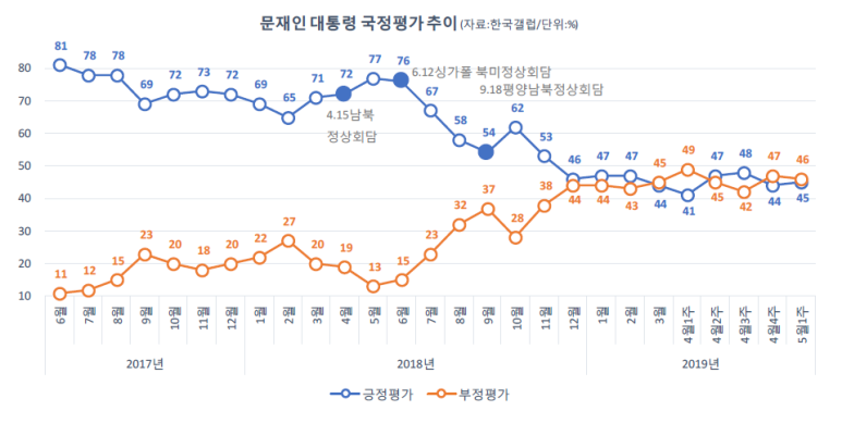 · 문재인 대통령은 취임 직후 81%라는 절대 다수의 국민들로부터 긍정평가를 얻었으나 2018년 말 부터 긍정/부정평가가 엇비슷하게 나타남