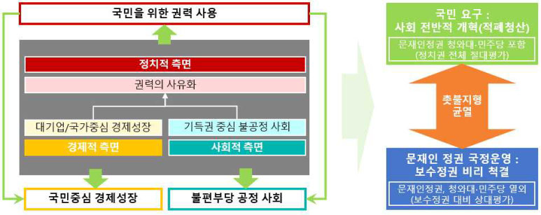 · 권력의 사유화와 이를 통한 불공정한 행위들이 낱낱이 드러나면서 국민들은 진영을 떠나 사회 전반에 걸쳐 있는 불공정성 해소를 강력히 요구함