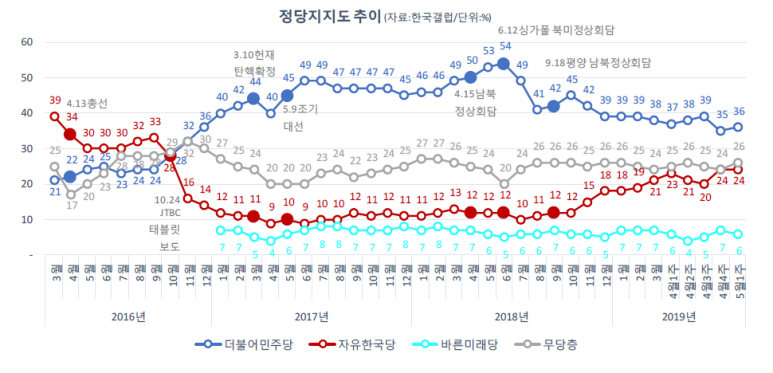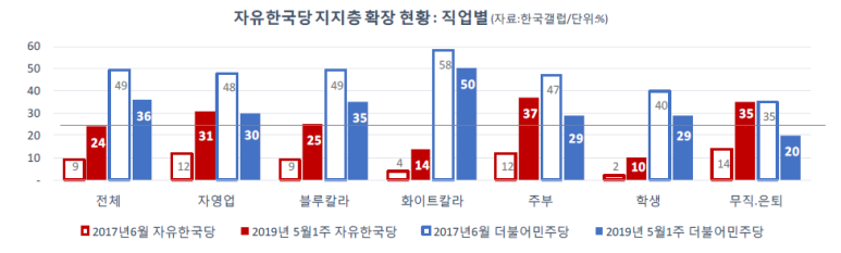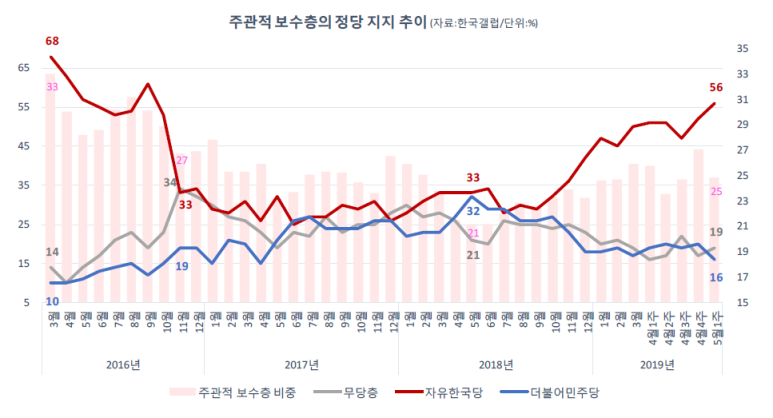· 특히 문재인 정부에 실망한 보수층이 자유한국당으로 회귀하면서 지지율이 정상적인 궤도에 올라섬