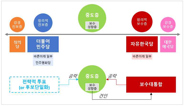 ❍ 선거지형에서 유리한 보수정당은 선거전략이 단순했고, 중도층 공략 방안에 주력하는 것으로 충분했음