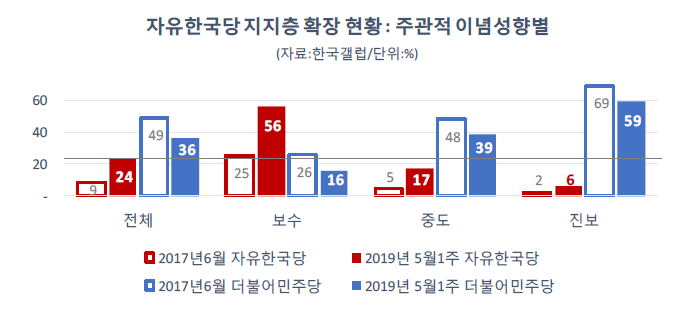 · 만약 보수층이 줄어든 상태가 유지되는 상황에서는 아무리 보수층이 자유한국당을 지지하더라도 전체적으로 지지층 확장에 큰 변화가 없었을 것임