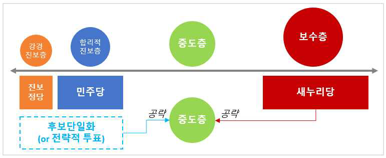 · 진보층 통합 방안으로는 진보정당과의 후보단일화를 추진하거나 유권자의 전략적 투표를 유도함(사표방지 심리 자극)