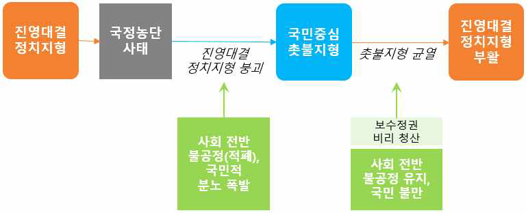 ❍ 한국사회 정치지형은 오랜 기간 동안 ‘보수 vs 진보’ 라는 진영대결 정치지형이 유지되어 왔으나, 2016년 국정농단 사태를 거치면서 ‘촛불지형’ 이라는 질적으로 새로운 정치지형으로 재편됨