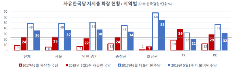 · 2019년 5월1주 현재 더불어민주당 보다 높은 지지율을 보이고 있는 지역은 TK지역임