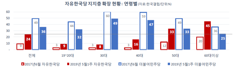 · 좀 더 추이를 봐야겠지만 현 지표만 놓고 볼 때 자유한국당 행보가 강경 보수층만 결집시킬 뿐 전통적 지지층 결집에는 실패하고 있다는 의미로 분석됨