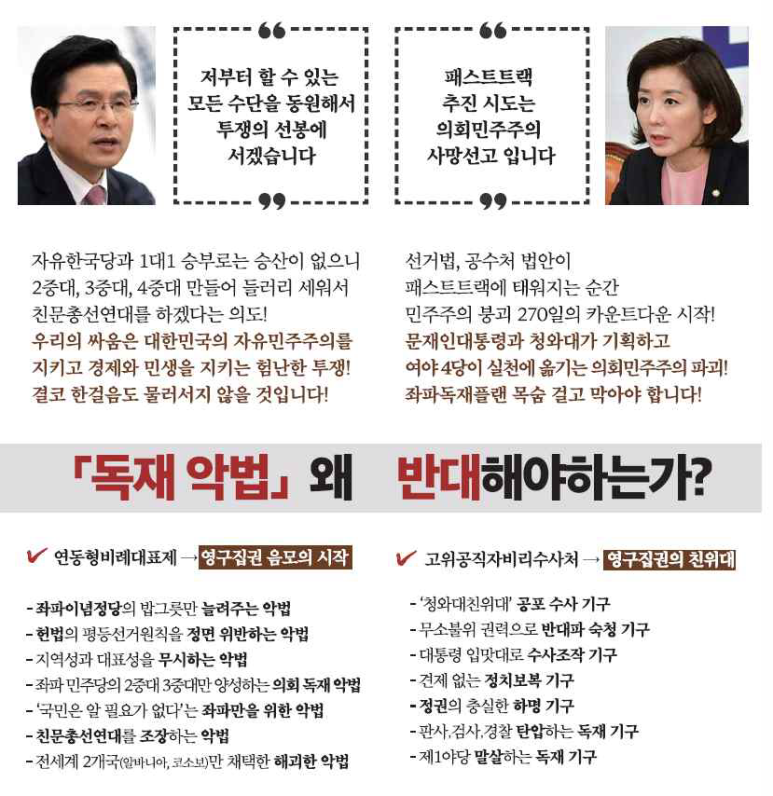 · 자유한국당은 대국민홍보물을 통해 ‘연동형 비례대표제’는 좌파 영구집권 음모의 시작이고, ‘고위공직자비리수사처’는 영구집권의 친위대라고 주장하고 있음