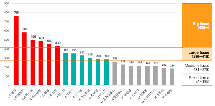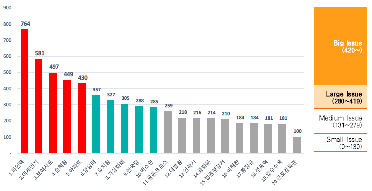 Large Issue로는 양승태 전 대법원장과 유치원, 가상화폐, 한국당, 박소연 대표 등이 올랐다. 자유한국당은 모처럼 국민적 관심을 받았는데 2월 전당대회를 앞두고 황교안, 오세훈 등 당권주자들이 활발하게 활동을 하면서 관심을 모은 것으로 보이며, 전당대회 시점까지 국민적 관심이 지속될 것인지 귀추가 주목된다.
