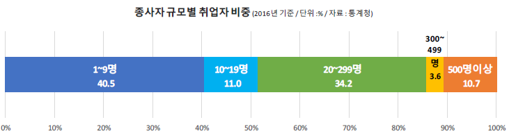 2차 노동시장이 89%에 달하는 것은 우리나라 임금 노동자의 고용이 중소기업에 집중되어 있기 때문이다. 아래 그림에서 보듯 500명 이상 대기업 취업자는 10.7%에 그치고 절대다수가 중소기업 취업자인데, 더욱 주목해야 할 점은 1~9명 사이의 소규모 기업의 취업자 비중이 40.5%로 매우 높다는 점이다. 10~19명 규모까지 포함한 20인 미만 소규모 기업의 취업자 비중은 51.5%로 과반수 이상의 취업자가 소기업에 종사하고 있다.