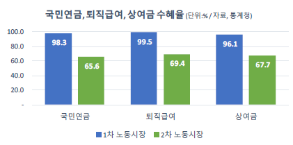 1차 노동시장과 2차 노동시장의 국민연금, 퇴직급여, 상여금 수혜율을 살펴보면 1차 노동시장은 100%에 가까운 노동자가 보호받고 있지만 2차 노동시장의 경우 70%에 미치지 못하고 있다.