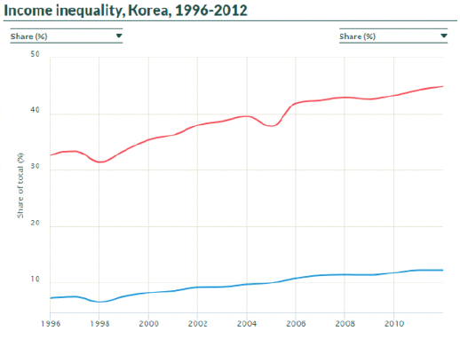 소득불평등 관련 통계는 [세계불평등보고서 2018]에서도 확인 가능하다. 한국의 상위 1% 부자는 1996년 7.3%의 부를 가져갔으나 2012년에는 12.3%를 가져갔다. 소득상위 10% 고소득층 역시 1996년 32.6%에서 2012년 44.2%로 비중이 늘어났다.