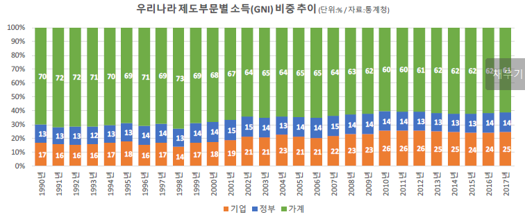 한국 경제는 다양한 위협 요인에도 불구하고 지속적으로 성장하고 있지만, 그 성장의 과실이 국민에게 돌아가는 비중은 점점 줄어들고 있는 것으로 나타났다. 우리나라 제도 부문별 소득(GNI) 비중을 살펴보면 1990년에는 가계 소득 비중이 70%였지만 2017년에는 61%로 줄어들었으며, 같은 시기 정부의 소득 비중은 거의 비슷한 가운데 가계 부문에서 줄어든 만큼 기업의 소득 비중이 올라가 성장의 과실을 기업이 더 많이 가져가고 있다.
