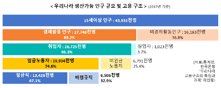 먼저 한국의 전체적인 노동력 규모와 고용구조를 살펴보면 2017년 현재 전체 생산가능인구(15세 이상 인구)는 4,393만명이며, 이 가운데 경제활동인구는 63.2%(2,775만명)이다. 경제활동 인구 중 96.3%인 2,673만명이 취업자이고, 실업률은 3.7%(102만명)이다. 취업자는 임금 노동자와 비임금 노동자로 나뉘는데, 임금 노동자는 74.6%로 1,993만명이며, 비임금 노동자는 25.4%로 모두 679만명이다. 마지막으로 임금 노동자를 근로형태로 나누면 정규직은 67.1%(1,342만명)이고, 비정규직은 32.9%(651만명)이다.