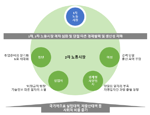 우리나라 노동시장 이원화는 오랜 기간 동안 구조화된 것으로 소득불평등의 주요 원인이자 고용난, 청년실업, 여성 경력단절, 자영업자 과다 출현 등 다양한 분야에 부정적 영향을 미치고 있는 것으로 분석된다. 가장 큰 문제로 지적되는 점은 계층이동(사회이동)이 단절되면서 부와 빈곤의 대물림 흐름이 뚜렷하게 나타나고 있다는 점인데, 이른 바 ‘개천에서 용 났다’는 말은 신화에 불과하고, 현실에서는 ‘금수저․흙수저’ 이야기가 상식이 되고 있는 상황이다.