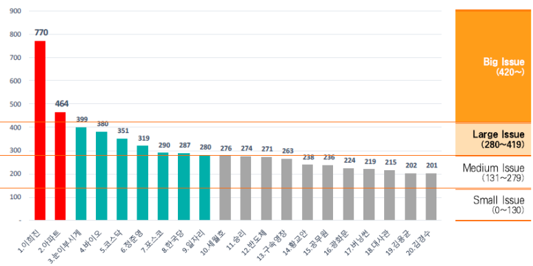 Large Issue로는 버닝썬 사태로 촉발된 정준영이 올랐으며 관련된 승리, 버닝썬 키워드는 Midium Issue에 머물러 국민적 관심에서 다소 멀어진 양상이다. Large Issue에 오른 ‘눈이부시게’는 치매 관련 드라마로 국민적 관심을 많이 받고 있으며, 더불어 치매에 대한 국민적 관심도 높아진 것으로 보인다.