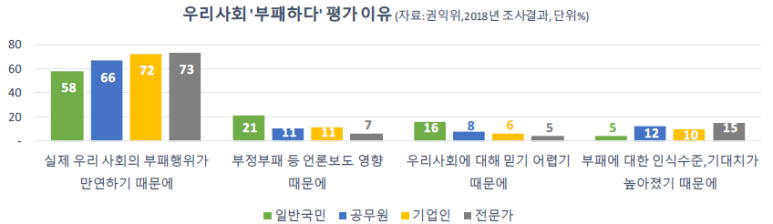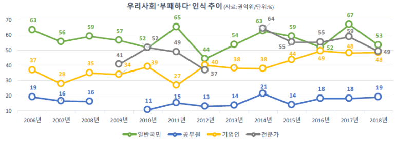 국민권익위의 2018년도 부패인식도 조사결과를 보면 국민 중 53%는 우리사회가 ‘부패하다’고 생각하고 있다(자료, 국민권익위). 최순실 국정농단 사태를 경험한 직후인 2017년에는 ‘부패하다’는 인식이 67%까지 치솟았으나 다소 하락하였다. 그러나 여전히 과반수 국민은 우리사회가 ‘부패하다’고 생각하고 있으며, 이러한 의식은 거의 한결같은 흐름이다. 이에 비해 공무원들은 ‘부패하다’는 인식이 19%에 그쳐 국민인식과 상당한 괴리를 나타내며, 공무원들은 2006년 부터 예외없이 ‘부패하다’는 인식이 매우 낮은 수준을 유지하고 있다. 교육·언론·시만단체 등으로 구성된 전문가들은 국민 여론과 비슷한 흐름을 보이고 있으며, 기업인들도 최근에는 국민여론과 같은 의견을 나타내고 있다.