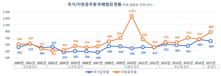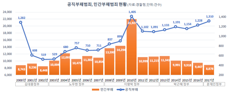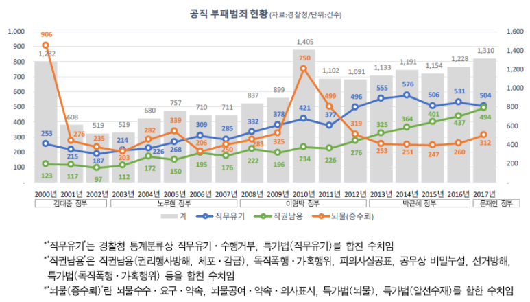 그러나 역대 대통령이 매번 공직 부패척결을 강조한데서 보듯 한국의 공직 부패범죄는 척결되거나 줄어들지 않고 끊임없이 발생하고 있으며, 2000년 이후 공직 부패범죄 현황을 살펴보면 김대중 정부 후반기와 노무현 정부시기에는 공직 부패범죄가 줄었으나 이명박 정부 들어 다시 증가세를 보였다(자료, 경찰청). 공직 부패범죄는 2008년 부터 10년간 지속적으로 증가해 2000년 수준으로 회귀하였고, 2010년의 경우 범죄가 급증했는데, 이는 당시 부패방지법 제정운동이 활발하게 진행되면서 공무원 부패관련 범죄사건 적발율이 상당했기 때문으로 보인다.
