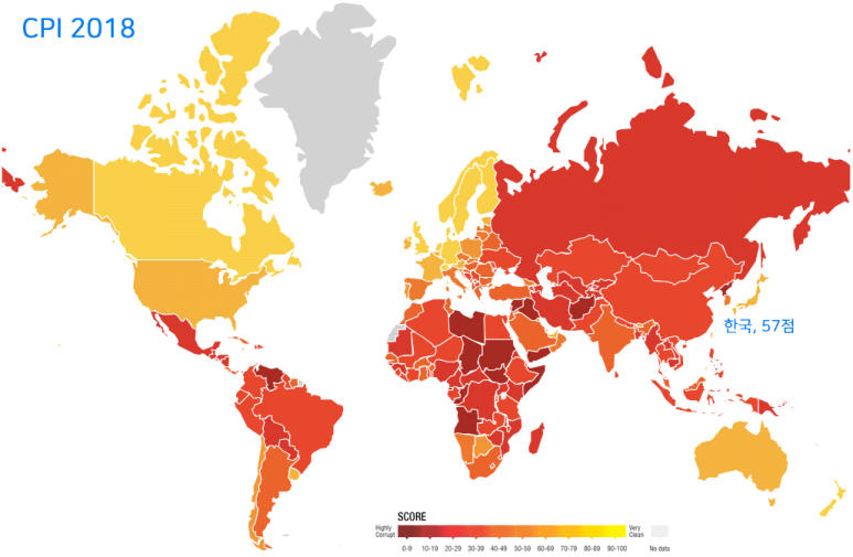 2018년 세계 부패인식지수를 살펴보면 미국, 서유럽, 호주, 일본, 대만 등은 부패 정도가 낮은데 비해 중·남미, 아프리카, 아시아, 동유럽은 부패 정도가 높은 것으로 나타났으며, 한국은 57점으로 조사대상국 180개국 중에서 45위를 기록하였다. OECD 36개국 중에서는 30위에 그친 것으로 나타났다.