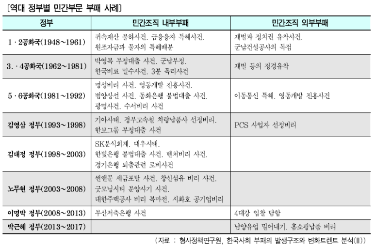 참고로 역대 정부별 민간부문에서 벌어진 대표적 부패 사례는 다음과 같다.