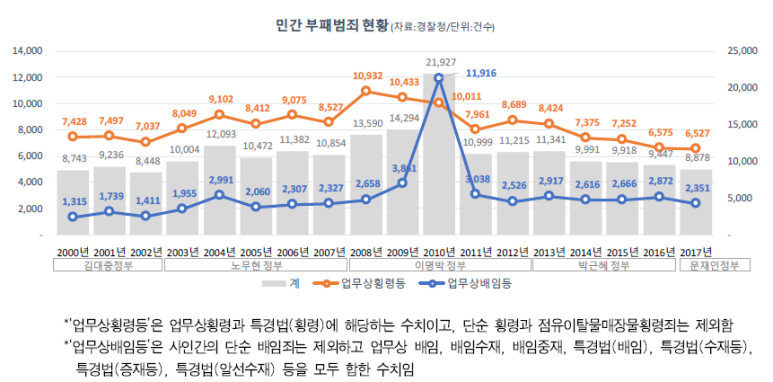 민간 부패범죄는 노무현 정부 당시 늘어난 이후 지속적으로 상승세를 보이다 박근혜 정부 후반부터 감소세로 돌아섰으나, 그럼에도 불구하고 2017년 범죄 발생건수가 2000년과 비슷한데서 보듯 민간부문의 부패범죄 역시 척결되지 못하고 있음을 알 수 있다. 2010년에 발생건수가 급증한 것은 공무원 범죄 증가 이유와 동일하게 부패방지법 제정운동이 활발하게 전개된 영향 때문으로 보인다.