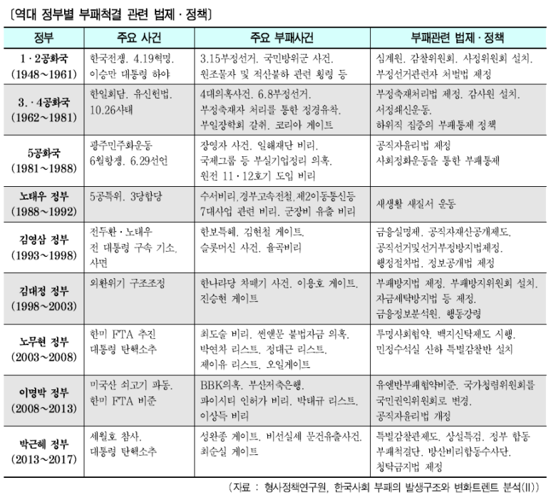 역대 대통령은 모두 공직 부패척결에 대한 단호한 의지를 피력하고 부패관련 정책을 추진해 왔다. 역대 정부의 부패관련 정책의 변곡점은 김영삼 정부 시기로, 그 이전에는 법적인 제도 마련보다 대통령의 ‘사정 의지’라는 권력운용 차원에서 일회성으로 공직사회 부패척결을 추진하였고, 김영삼 정부 출범 후 공직자재산공개제도 등 법적 제도를 마련하기 시작했다. 이후 대통령들 역시 공직 부패척결에 대한 법․제도 정비에 관심을 기울였었다.