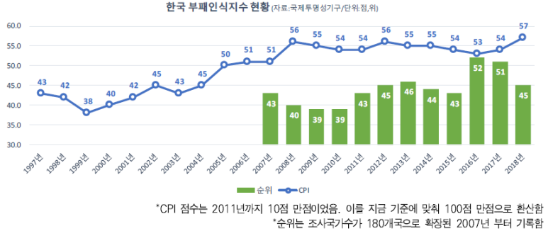한국은 조사에 포함된 1997년 이후 2008년까지 지속적으로 부패인식지수(CPI)가 상승했으나, 그 이후 현재까지 10년 동안 별다른 진전이 없고, 순위 역시 2007년 43위에서 2018년 45위로 제자리에서 맴도는 양상이다.