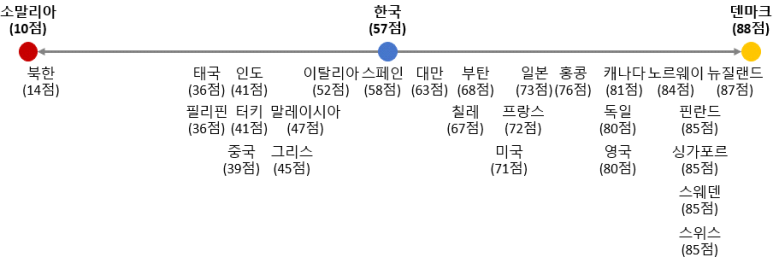 국가별로 자세히 살펴보면 덴마크가 88점으로 1위이고, 소말리아가 10점으로 최하위(180위)를 기록하였다. 상위권 국가들을 보면 뉴질랜드가 2위, 핀란드․싱가포르·스웨덴·스위스가 3위, 노르웨이 7위 등이다. 독일과 영국은 11위이고, 홍콩 14위, 일본 18위, 프랑스 21위, 미국 22위 등이며, 우리나라와 비슷한 점수를 나타낸 국가는 스페인 41위, 이탈리아 53위 등이다. 한편 북한은 14점으로 176위를 기록하였다.
