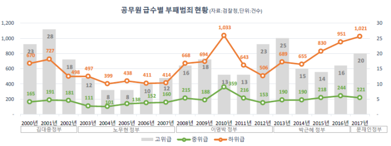 공무원 급수별로 살펴보면 6급 이하 하위직 공무원의 범죄가 급증하는 것으로 나타났다(자료, 검찰청). 6급 이하 하위직 공무원의 부패범죄는 2010년 최고치를 경신한 이후 줄어드는 모습이었으나 다시 급증하고 있어 공무원 부패가 직급을 떠나 만연해 있는 것으로 보이며, 전체 공무원 수에 있어 6급 이하 하위직 공무원의 비중이 절대적으로 높다는 점을 감안해도 증가세가 매우 높은 수준이다. 2급 이상 고위공무원과 3급~5급의 중위급 공무원의 부패범죄도 줄어들지 않고 있다.