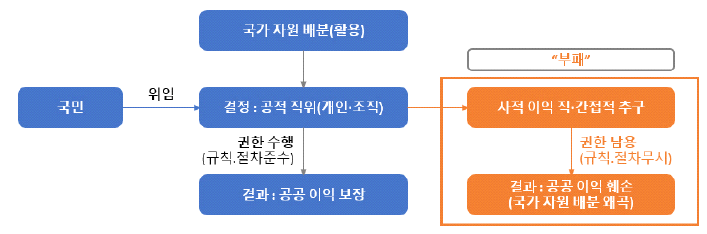 즉, 부패란 국가 자원 배분을 국민으로부터 위임받은 공적 직위의 개인·조직이 사적 이익(금전적, 지위상 이익)을 추구하면서 권한을 남용하는 것을 말하며, 공공 이익을 심각하게 훼손하는 결과를 낳는다.