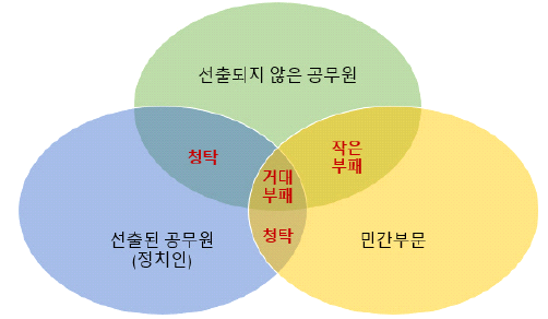 최근의 부패 유형을 분석해 보면 아래 그림처럼 선출된 공무원(정치인), 선출되지 않은 공무원, 민간부문 간의 연결구조 속에서 발생하고 있으며, 정치인과 공무원, 민간부문이 커넥션을 형성할 경우 거대부패가 만들어진다. 민간부문의 경우 정부기관·공무원이 없어도 민간조직이나 사업자 간에 다양한 방식으로 부패가 존재하고 있으며, 민간부문의 부패로 인해 공적지출이 발생하는 경우가 점점 많아지는 양상이다.