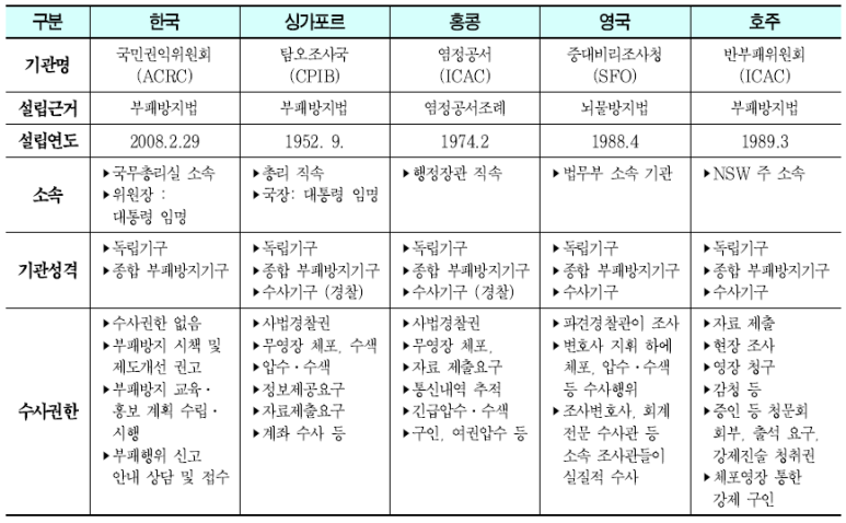 대부분 국가의 반부패 관련 기관은 법에 근거한 강력한 수사권 등 사법적 권한이 부여되어 있지만 우리나라에서 반부패 정책을 총괄하는 권익위는 수사 권한이 전혀 없으며, 반부패에 성공하고 있는 주요국가들의 반부패 관련 기관과 우리나라 권익위를 비교해 보면 다음과 같다.