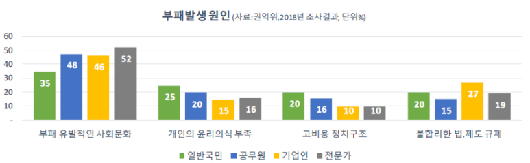 부패 발생 원인으로는 모든 조사대상이 ‘부패 유발적인 사회문화’를 꼽아 부패가 우리사회에 광범위하게 퍼져 있다는 인식이 매우 강한 것으로 나타났다. 다만, 일반국민의 경우 ‘부패 유발적인 사회문화’에 대한 응답이 타 조사대상에 비해 낮고(35%), ‘개인의 윤리의식 부족’(25%)이 높은 수치를 나타내 부패를 구조적 문제로 바라보기 보다 개인의 일탈로 보는 경향이 다소 강한 것으로 보인다. 한편, 기업인의 경우 불합리한 법·제도 규제가 부패행위를 유발한다는 응답도 많았다(27%).