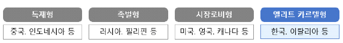 마이클 존스턴 교수(미국 콜게이트 정치학과)는 한국의 부패에 대해 ‘엘리트 카르텔형’이라고 진단하였고, 존스턴 교수는 아래 그림과 같이 부패를 4가지 유형으로 분류하고 있다. 독재형과 족벌형은 주로 후진국에서 나타나고, 시장로비형은 선진국에서 주로 나타나는 부패이다.