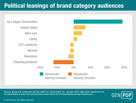 ▷ 입소스의 조사들을 보면 대부분의 브랜드는 다양한 정치성향을 갖고있는 고객들로 이루어져 있다. 하지만 주 고객들의 정치성향은 조금이라도 한쪽으로 기울어져 있기 마련이다.