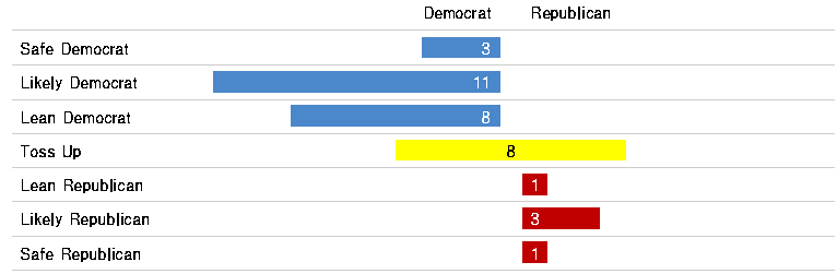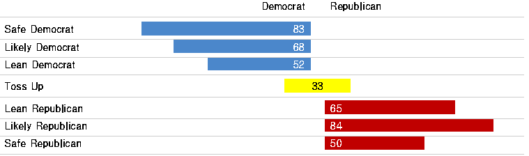 모두 435명을 선출하는 하원의원 선거의 경우 민주, 공화당 모두 과반의석인 218석을 획득하지 못하고 있는 것으로 나타났다. (자료 : 입소스 / 출처 : political-atlas.com / 10월11일 현재) 민주당이 모두 203곳에서 우세하고 공화당이 모두 199곳에서 우세하며, 다수당이 되기 위해서는 박빙인 33곳에서 민주당은 15곳, 공화당은 19곳을 가져가야 한다. 이러한 이유로 하원선거에서는 민주당이 다수당을 차지할 가능성이 높은 것으로 전망된다.