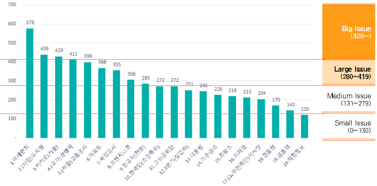 Large Issue는 (국가)경쟁력, (서울)교통공사, 아파트, 국정감사, 프란치스코, 정규직(전환) 등이다. 서울교통공사 정규직 세습 논란에 대한 국민적 관심이 높은 것을 볼 때 서울시의 적극적인 해명과 사후대책 수립이 필요한 것으로 보여진다. 아파트는 지속적인 관심사로 10월 3주차에도 Large Issue에 올랐다.
