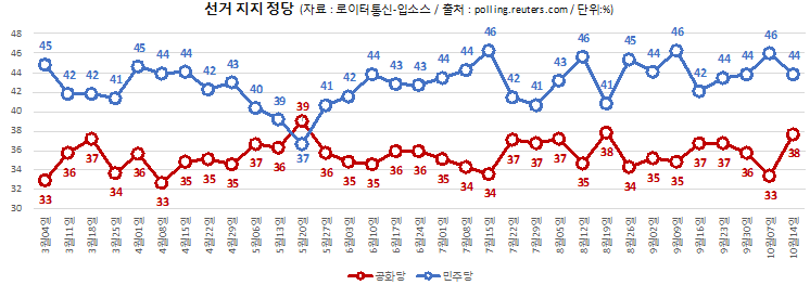 트럼프 대통령에 대한 부정평가 우세 흐름은 중간선거에 직접적인 영향을 미치고 있는 것으로 보이며, “오늘 미국 의회 선거가 치러지면 거주하고 있는 해당 지역의 어느당 후보에게 투표하시겠습니까?” 라는 선거 지지정당을 질문한 결과 민주당이 공화당을 앞서고 있는 것으로 나타났다. (로이터통신-입소스 여론조사 결과 10월 14일 현재 민주당은 44%, 공화당은 38%를 기록) 다만, 양당의 격차가 6%에 불과해(10월 14일 현재) 민주당의 압도적 우위라고 보기 어려우며, 선거가 다가올수록 민주당 지지층 결집은 물론 공화당 지지층도 결집하는 양상이다.